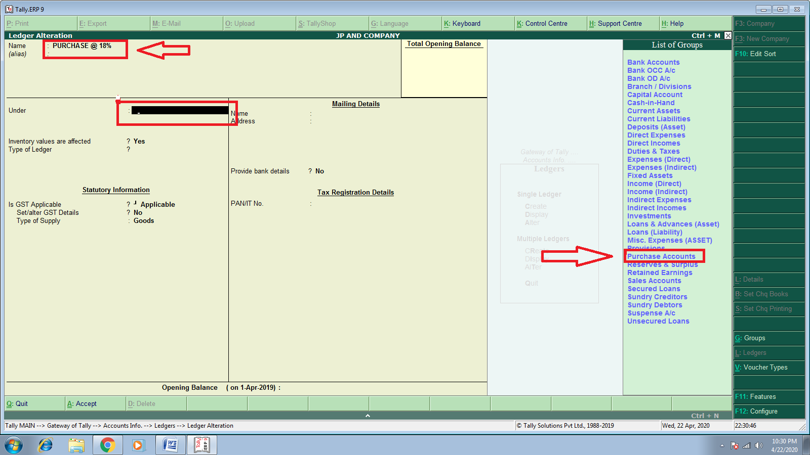 - Under : यह ऑप्शन बहुत ही महत्वपूर्ण है ! इसमें आपको उस ग्रुप का चयन करना होगा , जिसके अंतर्गत वह लेजर आती है ! जैसे Capital को Capital Group के Under डालेंगे ! किसी लेनदार पार्टी के नाम को Creditors Group में डालेंगे ! इसी प्रकार हमें Group का ध्यान रखना होगा कि कोनसी Ledger किस Group में आएगी !