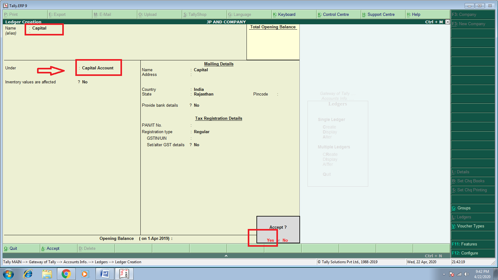 - Cr / Dr : ओपनिंग बैलेंस यदि शुन्य नहीं है तो यह ध्यान रखना होगा कि राशि डेबिट होगी या क्रेडिट !